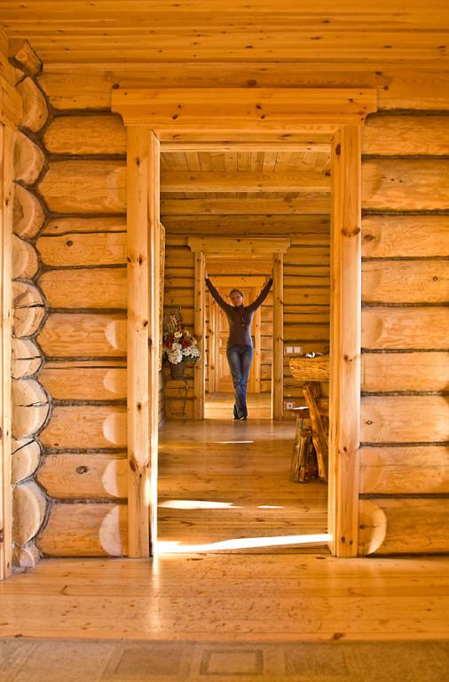 Домик представляет из себя настоящий сруб из толстенных бревен. Внутри — приличных размеров комната, большой коридор и ванная. В некоторых домиках — по два таких номера, каждый с отдельным входом и крыльцом, в других два номера объединены общей гостиной.