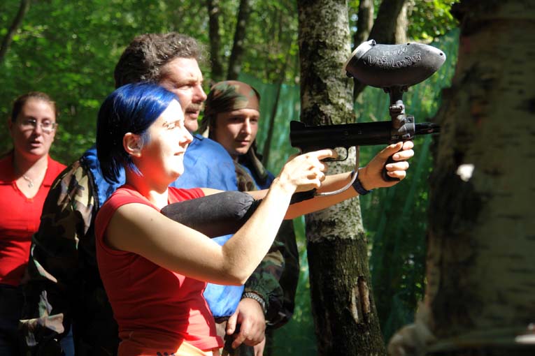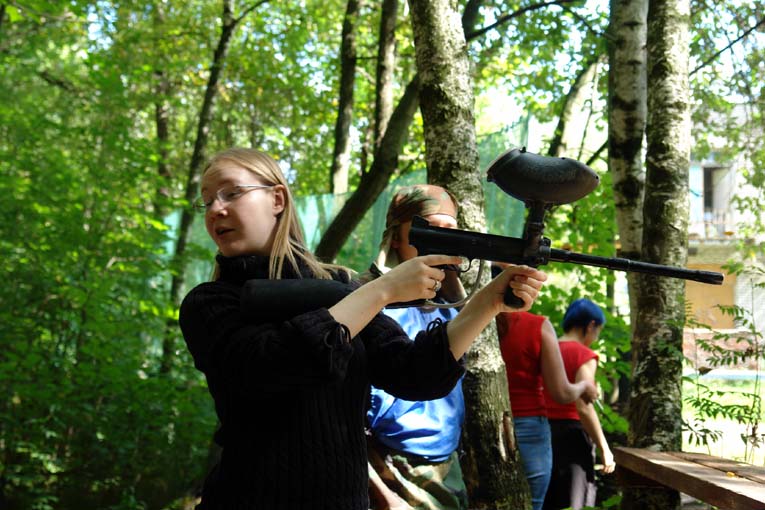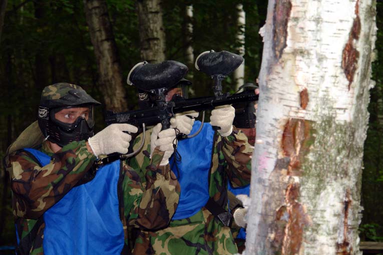 3. В первой игре нас отвели на новую площадку, которая представляла собой узкий прямоугольник шириной десять метров, с одной стороны которого находился форт, перекрывающий всю ширину площадки. Игроки (вначале нас было семь) разделились так: Я и Сережа Корнух защищаем форт, пятеро остальных на нас нападают. Нападающих отвели в другой конец площадки и велели ждать инстректора и команды к началу боя. Инструктор повел нас с Сережей на Форт, с нами пошел военный корреспондент Алексей Карпович, дабы запечатлеть нечеловеческие условия, в которых нам предстояло обороняться. Инструктор стал объяснять нам правила игры. В это время где-то на соседней площадке прозвучал свисток. Пятеро наших балбесов, опьяненных численным преимуществом (смешные ребята) осторожно начали пробираться к форту (мы этого не видели, поскольку слушали инструктаж). Осторожно пробирались не все: безбашенный Максим (Очевидец) побежал в атаку, оббежал форт с фланга и увидев нашу группу ( двое "гражданских" Алексей и инструктор были даже без шлемов) начал радостно садить в меня очередями, несмотря на мои вежливые увещевания типа "что ж ты, су*а, делаешь?). Извиняет только то, что он в меня не попал ни разу.