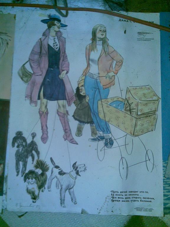 Awards Showcase Это чума!!! Обнаружила в подвале собственного дома, в комнатушке, в которой заседает комендант дома и бухгалтер, совершенно чумовые агитплакаты. Фото с телелфона, поэтому не самого лучшего какчества... постараюсь запечатлеть фотом... пока цените так: Дама с собачками. Пусть детей заводит кто-то, Ей иметь их неохота... Чем весь день стирать пеленки, Проще жизнь отдать болонке.