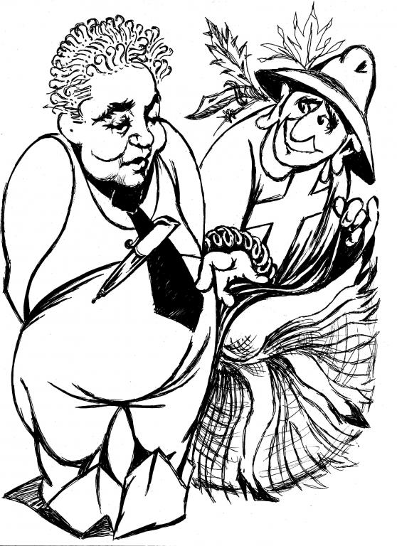 ...За поворотом стояли двое. Календарь успокоенно охнул про ёлки. Это были его товарищи - записные хулиганы и дебоширы Города, дантист Пужап в неизменной капитанской фуражке, снятой им по случаю с какого-то заплывшего морячка, и рецидивист Ар Синий в синем же костюме на голое тело, прозванный так за отсутствие свободной кожи под покрывавшими его целиком тату, которые отображали путь правильного пацана 58-ми лет с первой до задней ходки... ...Судя по всему, сегодня с утра они накурились «12 стульев»...