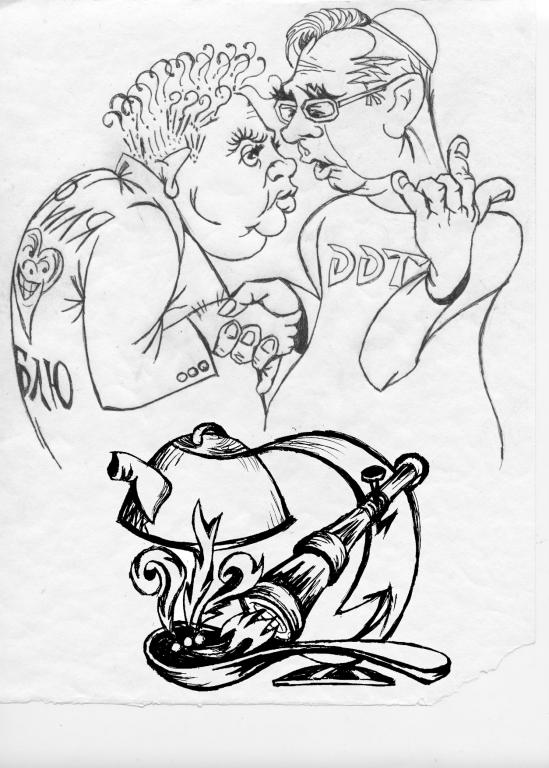 ...В обнимку с Пужапом и Ар Синим деловито приседала в импровизированном чардаше ещё одна парочка-не-разлей-вода, оба – журналисты из местной милицейской газеты. Один был бывший мент, а второй - будущий. Первого за прошлое звали Экспресс, а второго за будущее – Препресс...