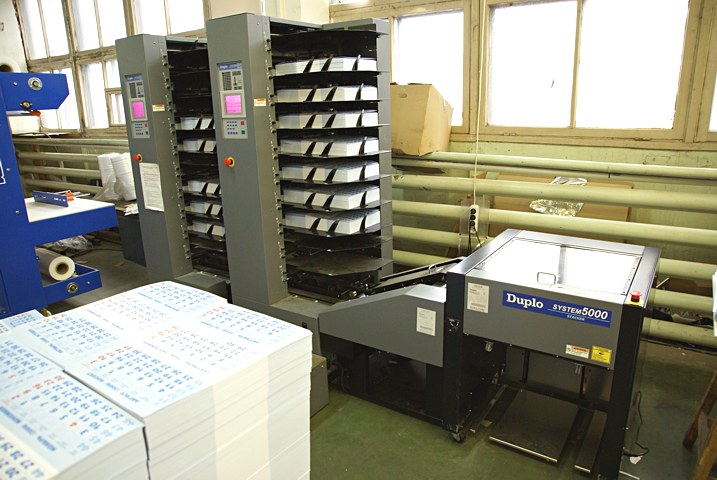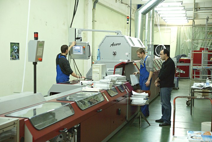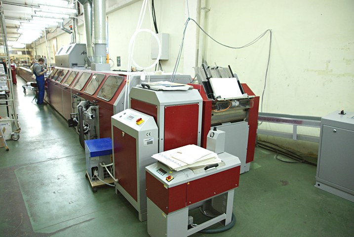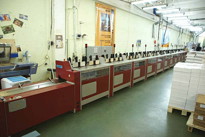 И на десерт - самое вкусное. Новенькая "Acoro A5" MULLER MARTINI. Подбирает тетрадки с 24 станций, клеит на горячий PUR или HQ клей, бигует обложку, подрезает брошюру с трёх сторон в линию. Длинная, красивая, блестящая (т.к. новая) машина.