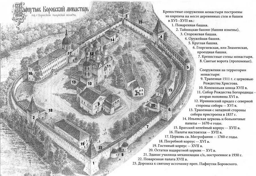 для Arsenij: Сколько себя помню проводятся экскурсии. Месяца два назад видел экскурсовода с группой ок. 12 человек. Женщинам на входе (тем кто в брюках) дают материю дабы запахнули под импровизированную юбку "непорядок". Для посещения закрыты реставрируемые объекты (таких не больше двух-трех) и те, куда ходить не положено. Фото их вряд ли найдёте и на сайте. По стенам мальчишкой я тоже гулял. Позже, шлепал по ним в сандалиях в составе экскурсии классе в третьем. Даже с ребятами клад искали (романтики!), а нашли баню и подземный ход, который ведет (говорят) вглубь Боровска (Монастырь стоит на Роще, километрах в пяти). Точно, Арсений. Святой источник за сторожевой башней (Монастырь необходимо обойти справа и немного спуститься). Там построилу купальню, напротив источника.
