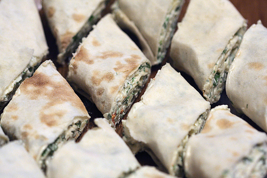 Готовится 2 вида начинки: мелко нарезанная зелень + выдавленный чеснок и свежемолотый перец, тёртый пармезан + панировочные сухари примерно 1:1.