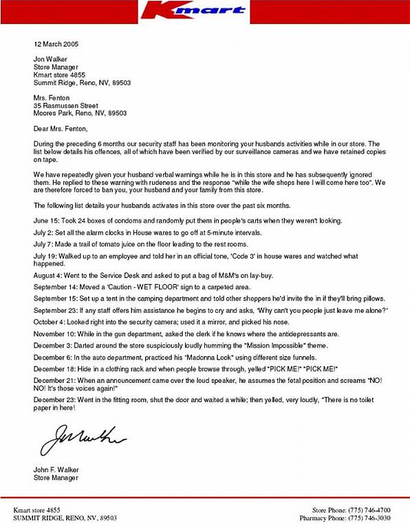 В предыдущие полгода служба безопасности нашего магазина пристально наблюдала за поведением вашего мужа во время его посещения нашего магазина. В приведенном ниже списке содержатся подробности совершенных им нарушений общественного порядка. Все инциденты подтверждены имеющимися у нас копиями видеозаписи с камер наблюдения.