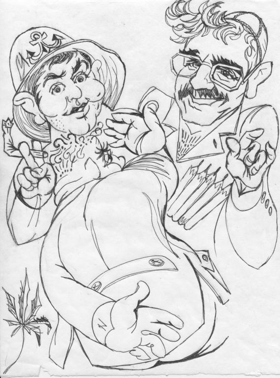 ...За поворотом стояли двое. Календарь успокоенно охнул про ёлки. Это были его товарищи - записные хулиганы и дебоширы Города, дантист Пужап в неизменной капитанской фуражке, снятой им по случаю с какого-то заплывшего морячка, и рецидивист Ар Синий в синем же костюме на голое тело, прозванный так за отсутствие свободной кожи под покрывавшими его целиком тату, которые отображали путь правильного пацана 58-ми лет с первой до задней ходки... ...Судя по всему, сегодня с утра они накурились «12 стульев»...