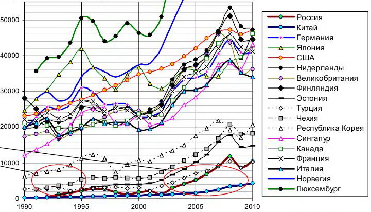 "С кем надо сравнивать" - это как раз и есть самый большой вопрос статистики. Сравнивать надо сравнимое, это еще в начальной школе нам говорили. На первых страницах наших обсуждений вы предлагали хоть какой-то общий знаменатель: "другие нефтедобывающие страны ушли далеко от нас". Но я вас спросила: "А они что, начинали с нами на одном уровне?" Валерий, вы, как человек, разбирающийся в математике, правда считаете, что в GDP per capita мы должны сравниваться с Люксембургом? Или даже с Норвегией? Вот мы с Китаем начинали в одной точке, так давайте хотя бы с ним! Тем более, что он тоже входит в ТОП-6. Давайте хоть какую-то математическую справедливость иметь.