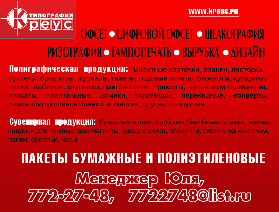 __________________ ТипографияКРЕУС kreus@mail.ru www.kreus.ru Юля 8-925-772-27-48,8-495-978-51-99